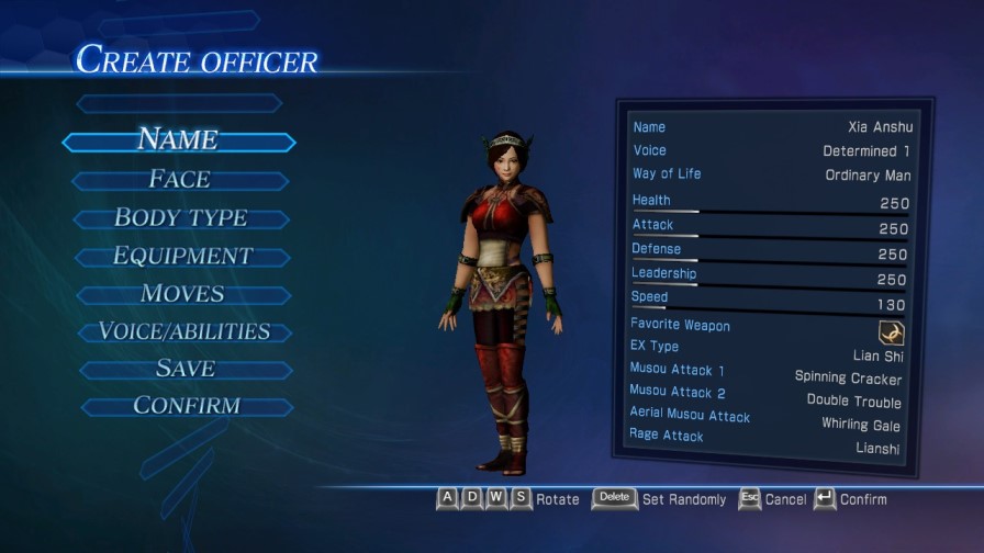 エディット武将の動きは武器によって変わります。既成プレイアブル武将と一部過去作の武器・モーションから選べるようになってるシステム。作ったキャラに色々持たせて似合う似合わないを見るのも楽しい。