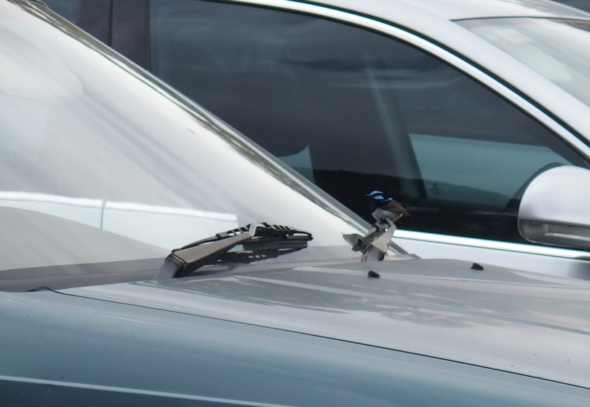 右の写真は車に止まったWren(ミソサザイの仲間)。こんなに小さいけどオスならこういう風に青い体がなんとか見えます。