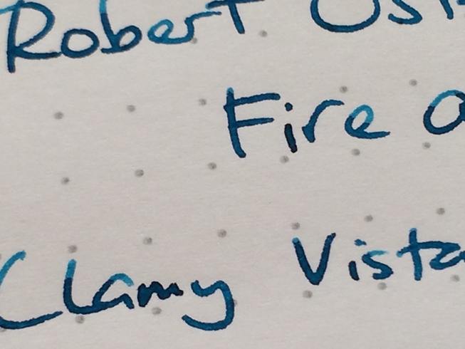 Rhodiaの紙に書いてみるとこんな感じ。写真に撮るとちょっと青みが強くなりますがもっと緑っぽいです。書くのに使ったペンはラミーのサファリのクリア(Vista)の中字です。