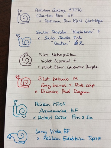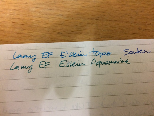 そしてラミーのサファリ(透明)が空になってニブもEFに交換するついでにアクアマリンインクも試し書き。比較対象が同じエーデルシュタインシリーズのトパーズ、セーラーの蒼天だってのもありますが胸を張ってこれは緑色と言える色彩。