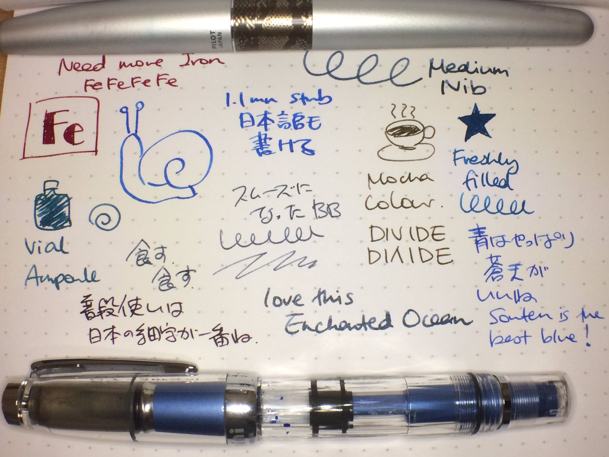 (1)ブルーブラック・長文担当のプラチナセンチュリー(シャルトルブルー)細軟字+セーラージェントルインク・ブルーブラック(耐水インクも担当させるか)