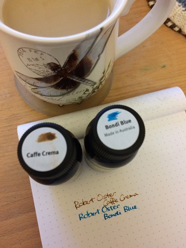 Robert OsterインクのCaffe CremaとBondi Blue。マグに入ってるのは比較になってるかどうかわからないコーヒーではなくチャイ。