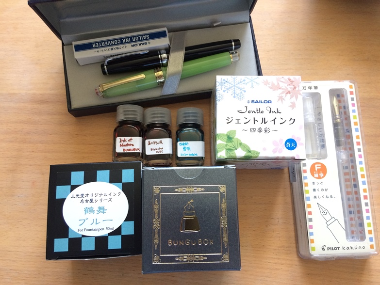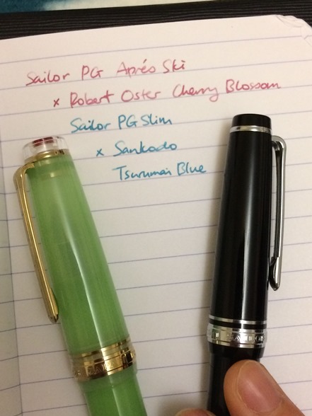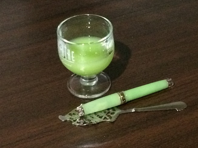 左の写真がその新入り2本です。日本橋高島屋の一部界隈で有名なセーラー担当ntさんのとこで購入。緑の方はセーラーのプロギア限定モデル、カクテルシリーズのアプレスキー。右の写真で見るとおりアブサンの色にそっくり!(アプレスキーにもペルノーが入ってます)というのとRobert Osterの桜色インクのおうちを探してたので予約のお知らせが奇跡的なタイミングで来たときはかなり念を込めて予約しました。