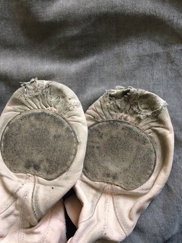 2年前、30の誕生日を迎えるちょい前にバレエを再開したときに買ったバレエシューズ(キャンバス生地)のつま先辺りがすり切れて穴があいてきまして。今こんな感じ。