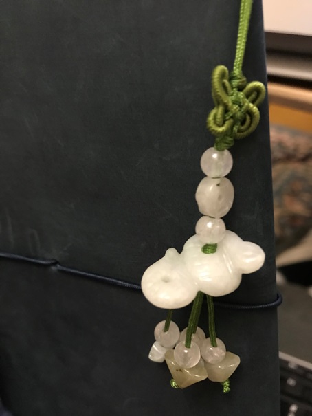オンラインで頼んだ店はイニシャルスタンプは3文字まで無料なのでイニシャル入れてもらいました。レギュラーサイズです。なんか漢詩とか書いててページに納まらなかったら悲しいなと思ったのが主な理由です。そして付けてるストラップは昔シンガポールの空港で買った翡翠の干支ストラップ。1985年丑年生まれですが蛇ものが欲しかったので巳に。いいなあ中国系装飾品。こんどチャイナタウンでどんなものがあるか見に行くかな。