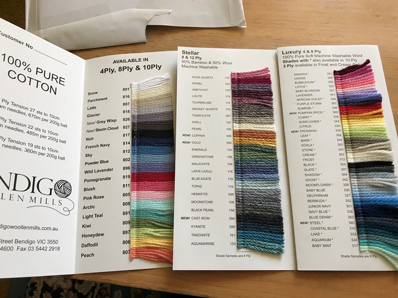 メルボルンの北西にあるBendigoという街にあるBendigo Wollen Mills。編み物する友人に教えてもらった店の一つです。こうやって毎年毛糸の色サンプルをオンラインで注文できるようにしていて、羊毛だったり木綿だったり竹と混合だったり種類も色々(写真では見えない折り込まれたページもあります)。もちろん毛糸自体のサンプルなので手触りも試せる。
