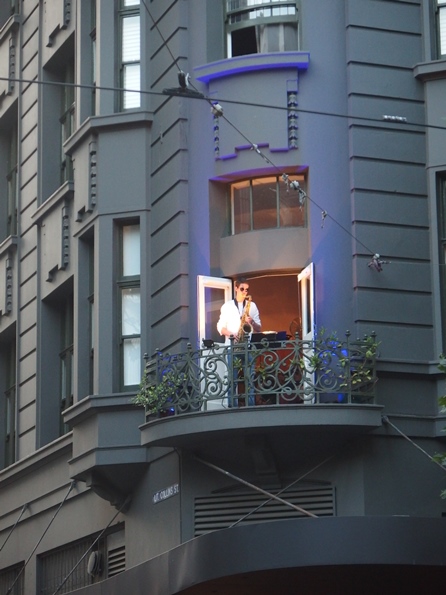 今回ナイスアイディアだったのが音楽のパフォーマーをこういう風にSwanston Streetに面するバルコニーに配置したこと(他にもMelbourne Town Hallのバルコニーでオペラとか、別の長めのバルコニーでポリスコスで歌って踊ってなんかもやってました)。なんたって一番人通りが多い通りなのでこういう形のほうが奏者にとって安全だし集中しやすいですし、風景としても街と一体になる感があって面白い。