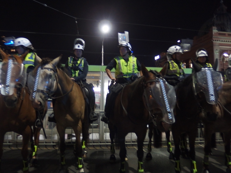 色んな見世物に写真を撮ろうと人が群がる中、同じくらい注目を集めてたのがこちら。デモ行進とかの時でも出てくる警察の騎馬隊。色々メルボルンでも物騒な事件があったりしたこともあってFlinders Streetあたりに2箇所配置されてました。人も多いし一晩中のお祭りですがありがたいことです。