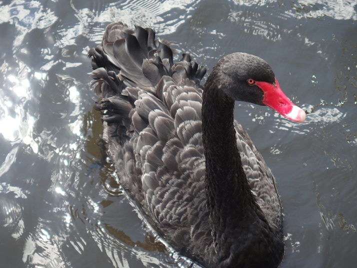 スワンさんです(日本ではスワン=白鳥ですがオーストラリアでは白鳥がいなくて黒鳥がデフォルトなのでスワン=黒鳥です)。2羽いました。よくみるのは2羽セットor1羽と子供連れな印象があるのでつがいなのかな?