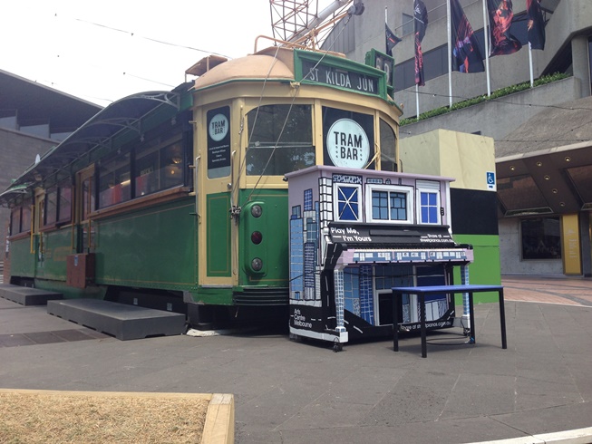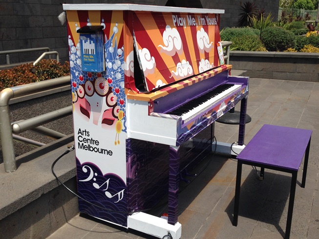 私がシティに出かけてたのもちょうどその日々だけで、Princes Bridge、Arts Centreの野外彫刻The Waveの傍、State Theatre前Tram Barの傍、その近くにある写真の1台、そしてNGV前と5台だけ見つけました。サイトにある地図によると自分の行動範囲内に多くあるので見つけたいです。そして一人じゃなければ弾きたいです(笑)