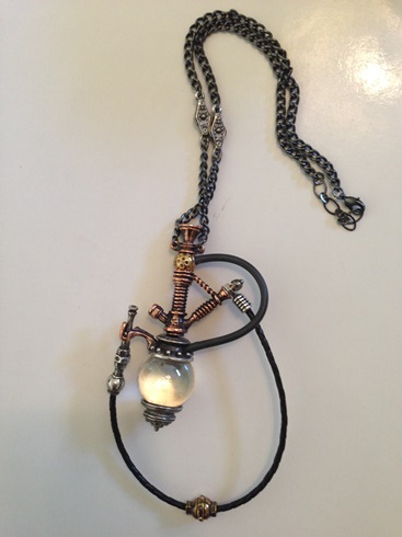 これは阿片とかを吸うための装置をモチーフにしていますが、そのため左側の吸い口のとこは引っかけたり外せるようになってます。3色のpewter、胴の透明なガラスの球、そしてゴム製のチューブなど多彩な材質でできてる面白い作品。着けるのが楽しみ。