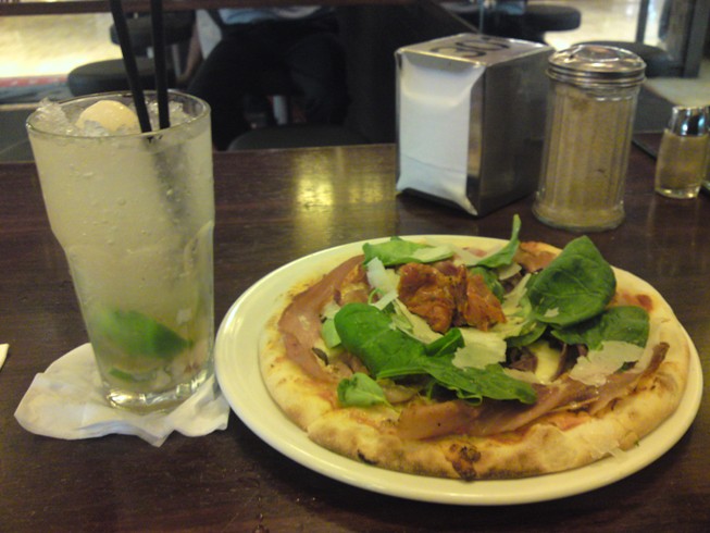生ハム、ほうれん草、ブラックオリーブ、パルメザンなどが乗ってるピッツァ。