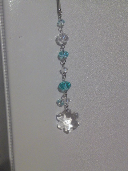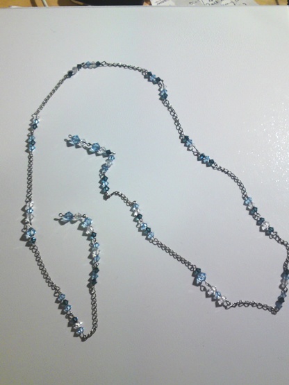 ライトサファイア、紺色(おそらくモンタナ)、クリスタルのそろばん型スワロフスキービーズ、銀色のチェーンと9ピンを組み合わせて作ってみました。