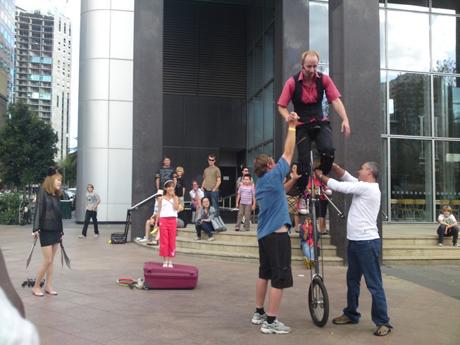 写真の演技が一番大掛かりで、観客からヘルパーを募ったところ韓国人のお姉さん、レバノン人の父娘、そしてキャンベラから来たというほろ酔いで真っ赤なおじさんが参加。パフォーマーがカナダ出身ということでなんかものすごく多国籍なパフォーマンスになりました。