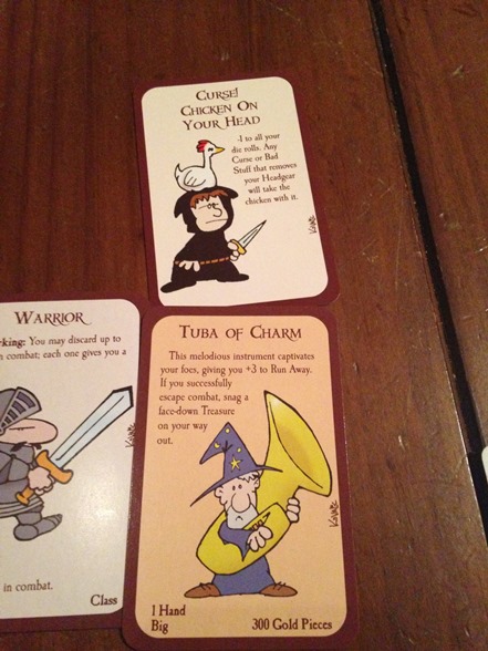 で、右が私が持ってった&前回のエントリーで紹介したMunchkin。テューバのカードはゲームに関係ないところで色々ツッコミどころがある(なぜか片手アイテム、「melodious」な楽器、などなど)。そして上にあるのが「頭の上にニワトリ」の呪いカード。これは逃げる時に若干不利になるカードなのですがそんなに悪いもんでもないのでみんな必要がない限り放っておくことが多い。