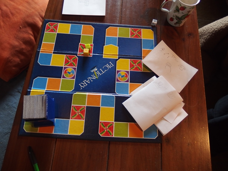 こちら室内で遊んだゲーム。Pictionary(左)はすごろく+絵心ゲーム的なボードゲームで、こっちではボードゲームの基本というかボードゲーム持ってる人は大体これも持ってる(あとScrabble)。実際これはこの家に備え付けであったPictionary。他にもジェンガとかもあった。