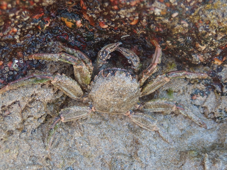 ちなみに砂浜がメインのこのエリアですが岩場もたまにあって干潮時にはタイドプールで生物観察も。ウメボシイソギンチャクいっぱい。あと右の写真のようなカニもいました。